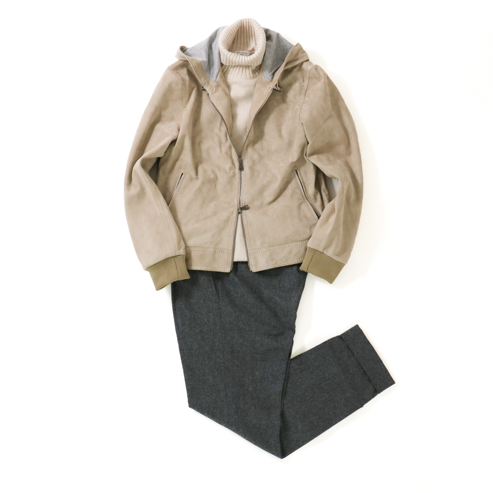 ITEM : BLOUSON / RING JACKET Napoli PRODUCT NO. : 59082F11G MODEL : LEATHER HOODIE PRICE : 275,000- YEN (tax included) MATERIAL : SHEEP SUEDE 100% SIZE : 1 . 2 . 3 . 4