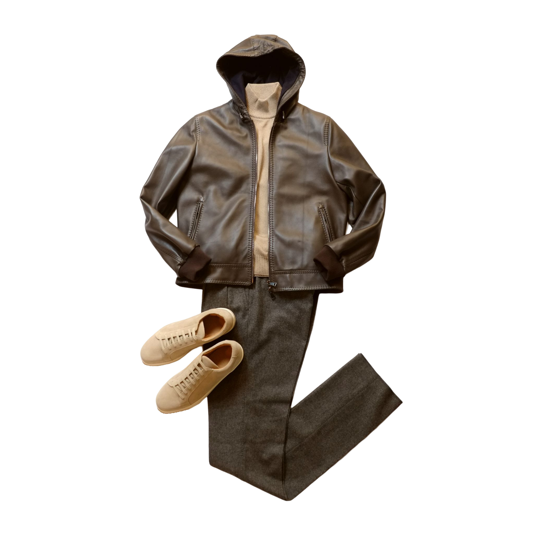 ITEM : BLOUSON / RING JACKET Napoli PRODUCT NO. : 59082F12F MODEL : LEATHER HOODIE PRICE : 275,000- YEN (tax included) MATERIAL : SHEEP SKIN 100% SIZE : 1 . 2 . 3 . 4