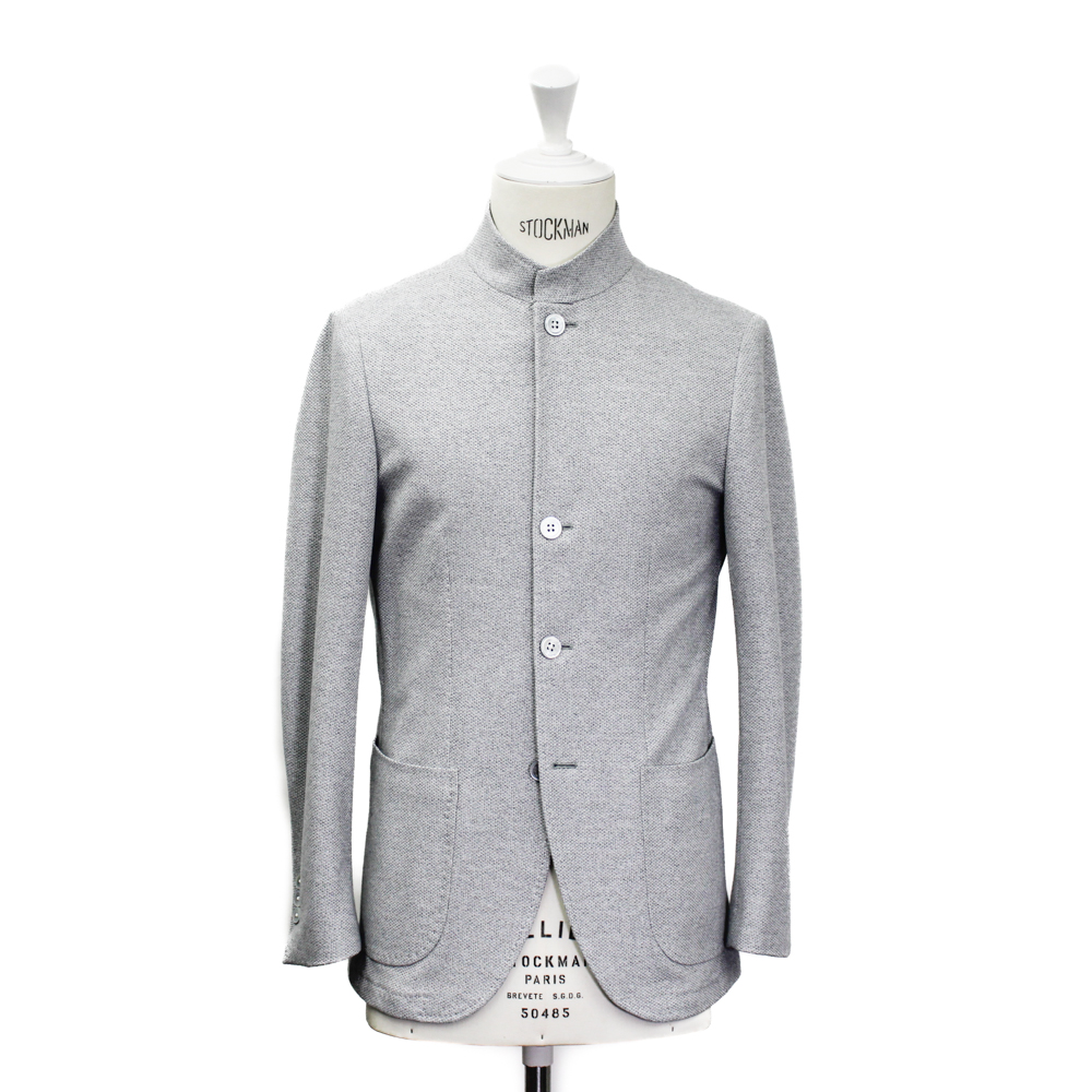 新たに提案するスタンドカラージャケットを主役に据えたコーディネイト。コットンジャージー素材ならではの柔らかな着心地と、ざっくりとした織りが生み出す立体的な表情が特徴です。軽やかな構造と相まって、リラックス感がありながらも品のある佇まいを感じさせます。