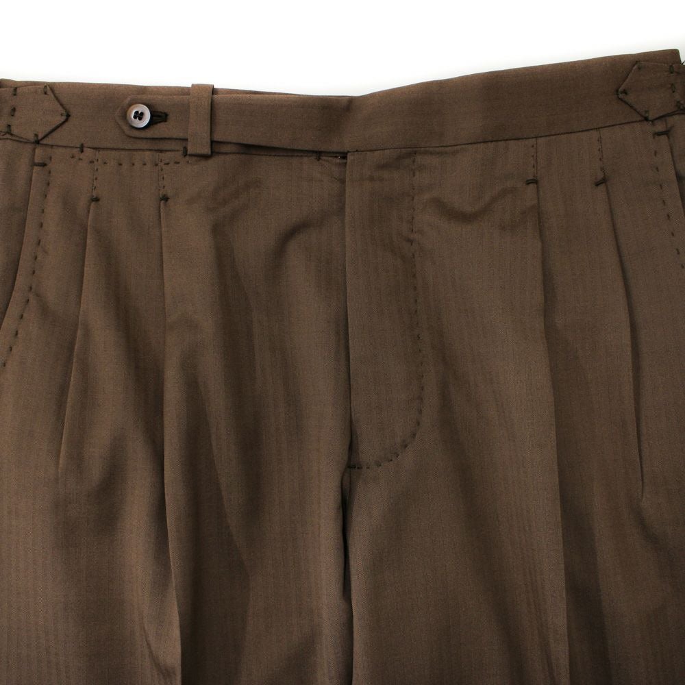 ナポリメイドならではの柔らかな仕上がりが特徴のマシンメイドパンツ。 2プリーツで、程よく深い股上とゆとりを持たせたワタリ巾、裾にかけてテーパードのかかるシルエットが少しモダンな印象も与える。 サイドアジャスター仕様で腰回りがすっきりと収まるのも魅力の1つです。
