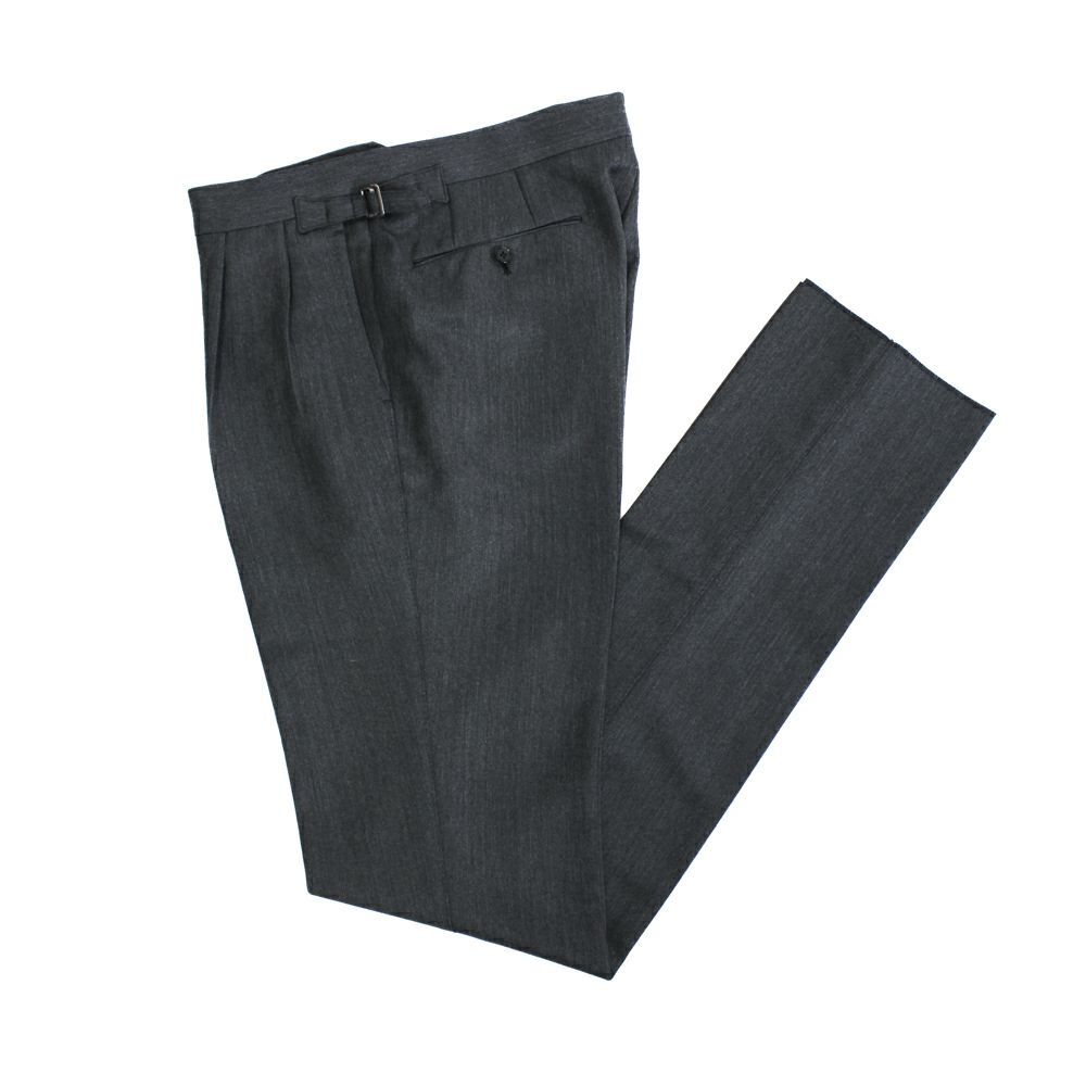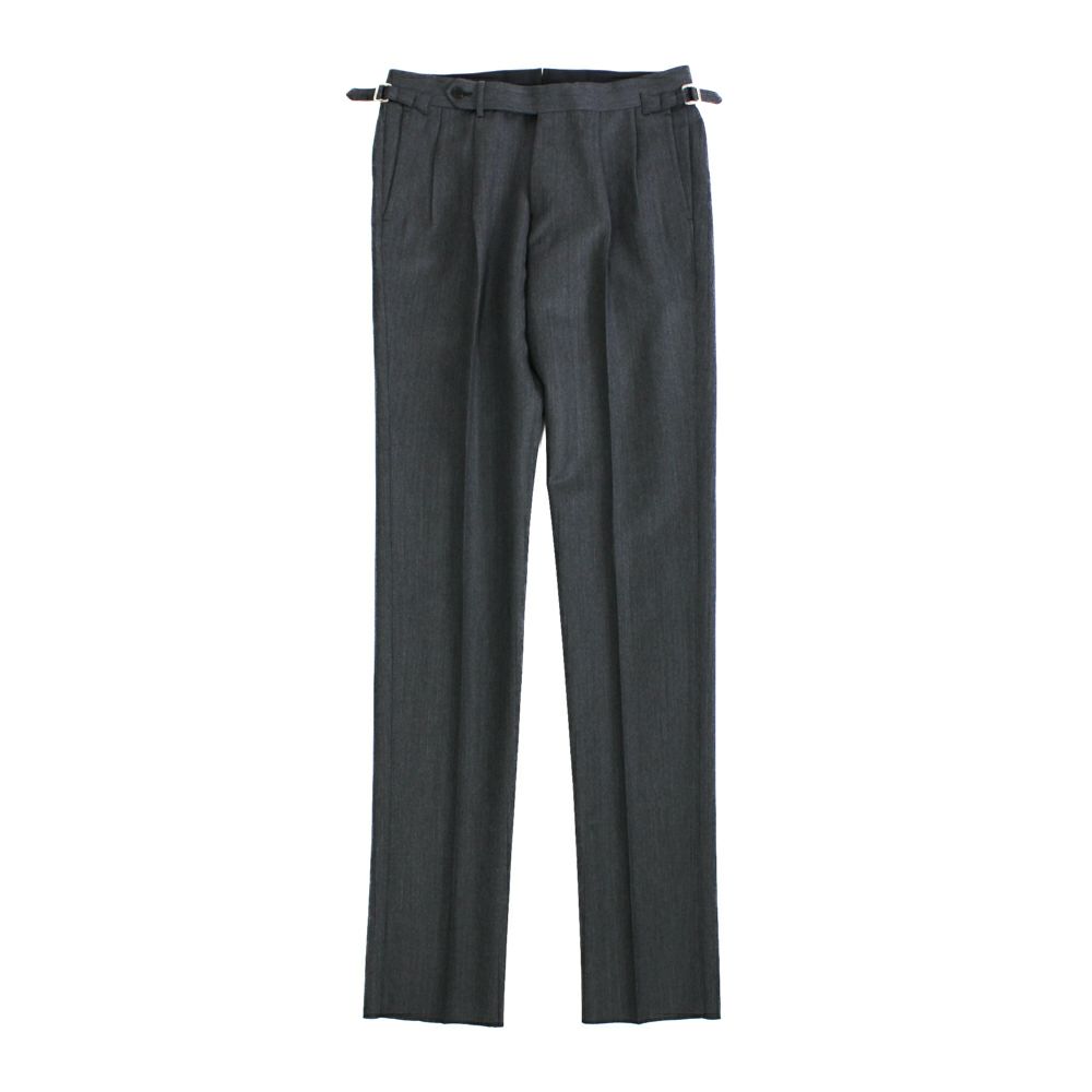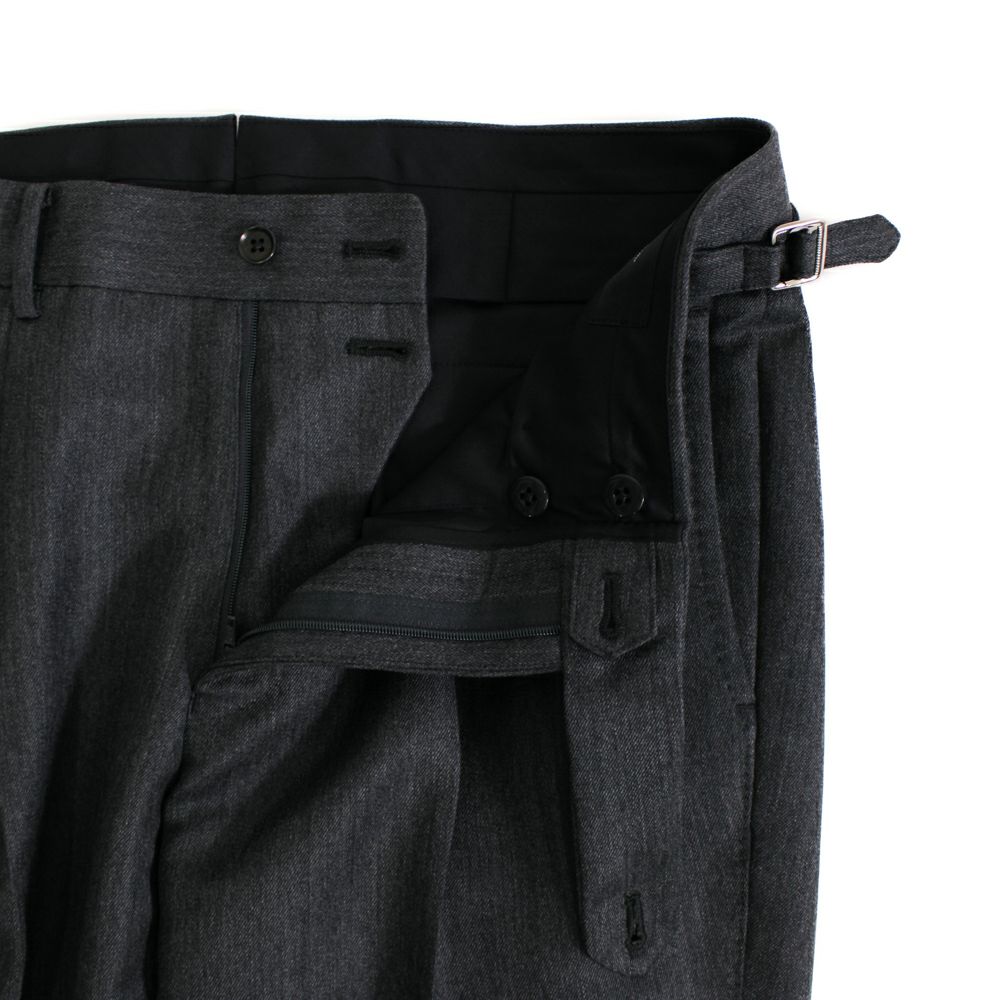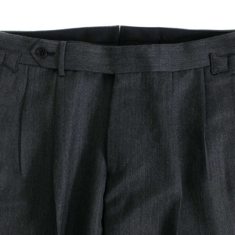 クラシックな表情の2プリーツスラックス。 程よく深い股上とゆとりを持たせたワタリから裾にかけてはテーパードラインとなっており、古臭さを感じさせないシルエットです。 ベルトをしないサイドアジャスター仕様なので腰回りがすっきりと収まるのも魅力の1つです。