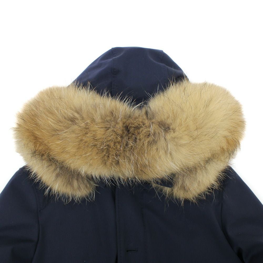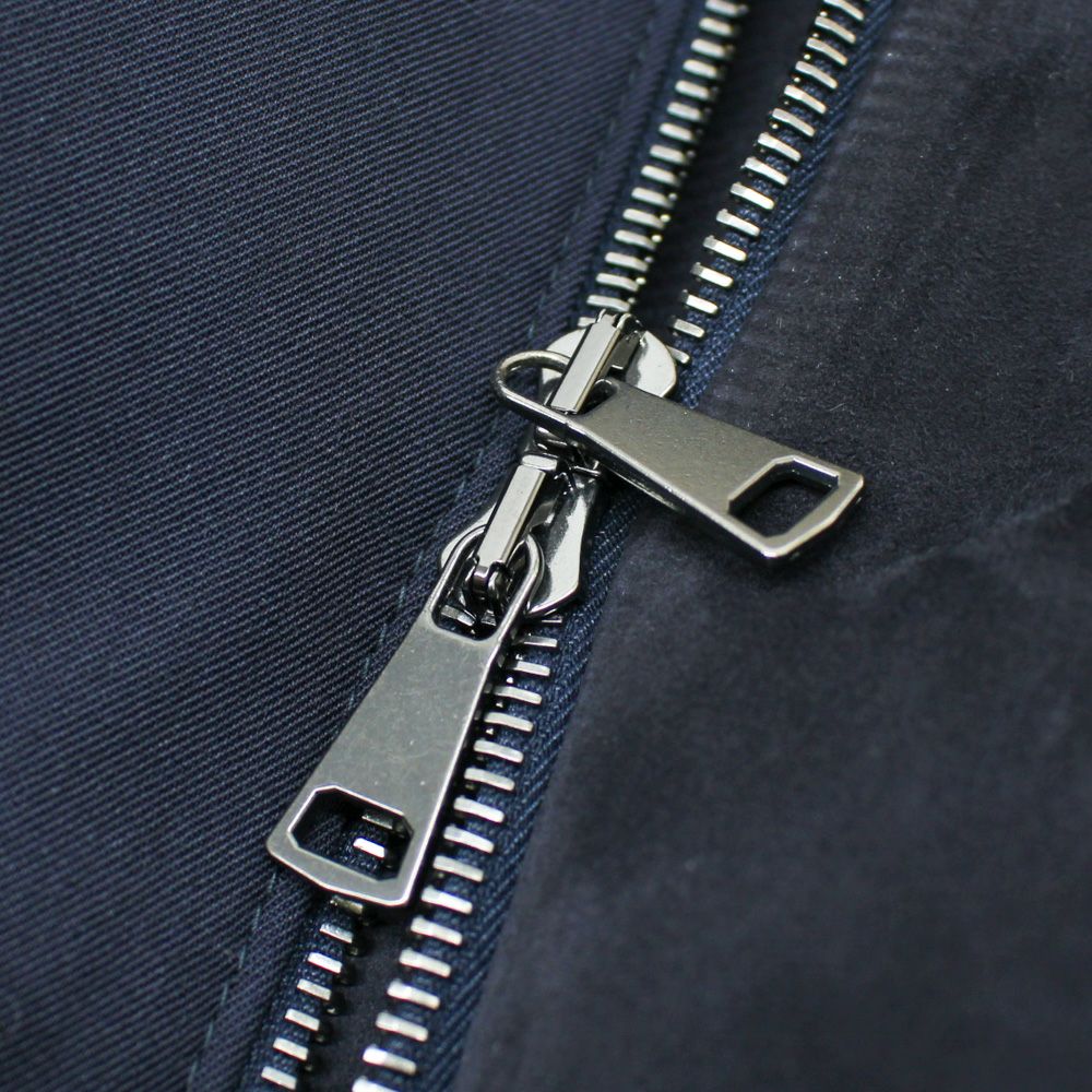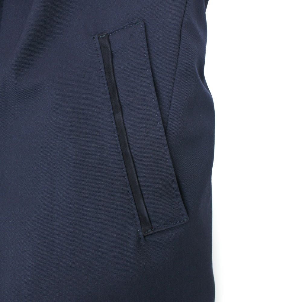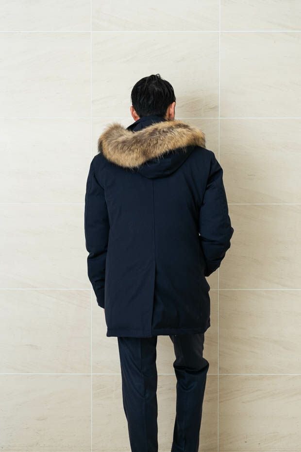 モノづくりの聖地ナポリにて、ダウンコート製作のスペシャリストが手掛けたダウンコート。 フードは取り外し可能で、取り外すとハーフコートのような、ダウンコートではあるがスーツやジャケットの上からでも着用しやすいデザインに仕上がっている。 というのも、中でダウンが膨らむような形、表地に撥水加工を施したウールを使用する事でスポーティーな印象が強くなり過ぎない、ドレススタイルにも着用しやすいダウンコートである。 ディテールを見ていくと、まずは襟やフロントにあるステッチ。これがダウンコートには珍しく、ほかにない表情を魅せてくれる。そして、その襟やフロント部分には上質なシープスウェードを使用し、高級感のある仕上がりに。ボタンはリングヂャケットオリジナルのブリーチ加工の水牛ボタンを使用。