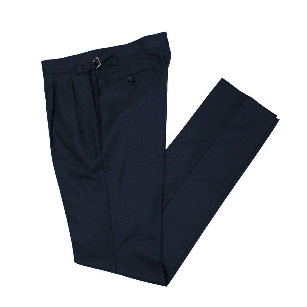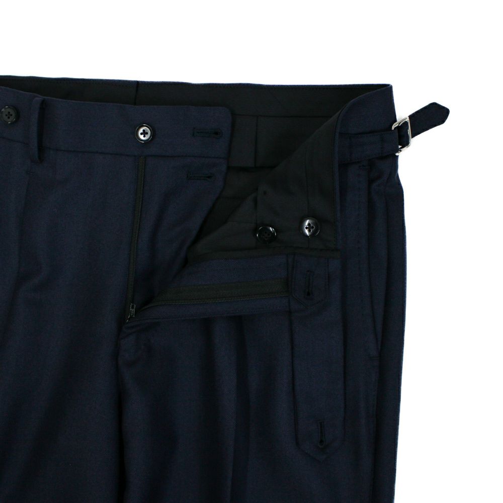 クラシックな表情の2プリーツスラックス。 程よく深い股上とゆとりを持たせたワタリから裾にかけてはテーパードラインとなっており、古臭さを感じさせないシルエットです。