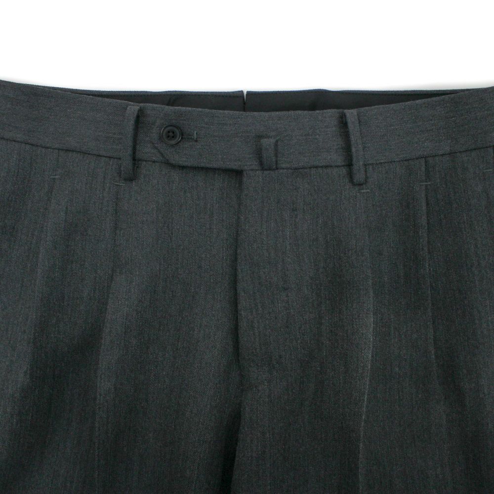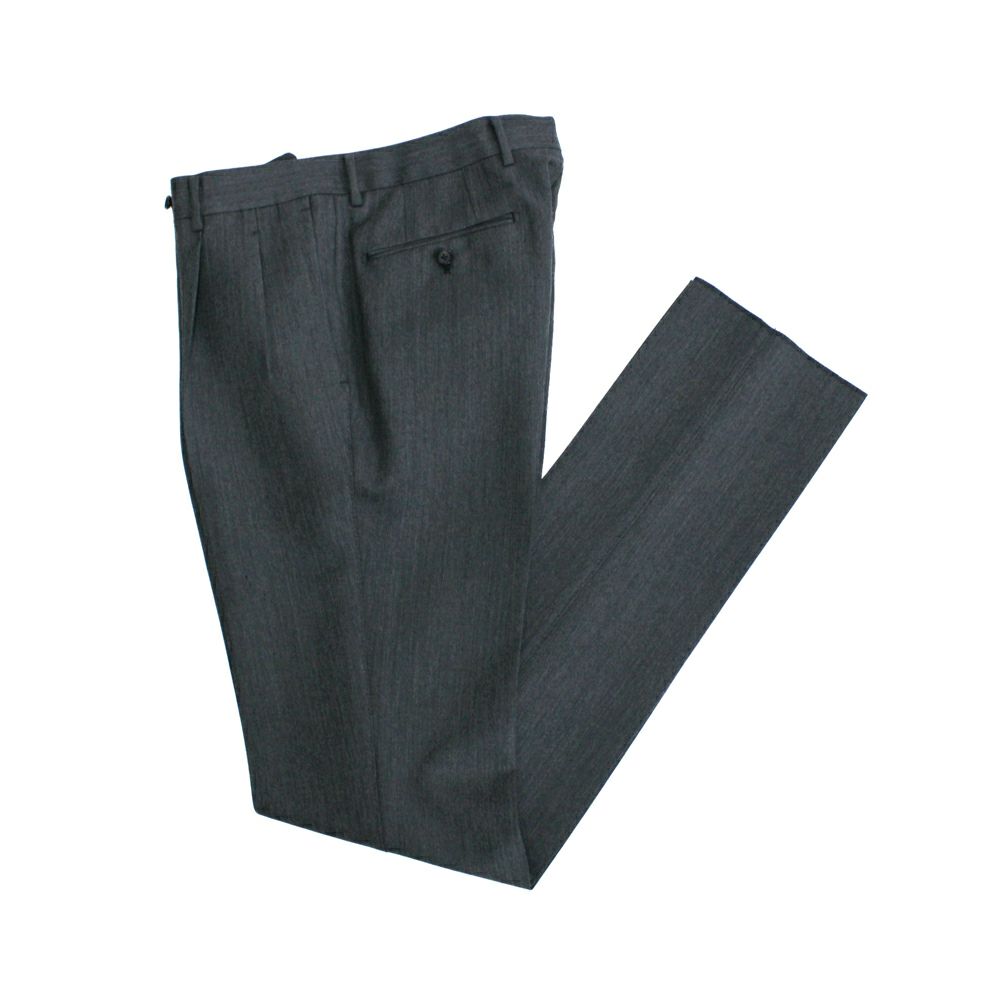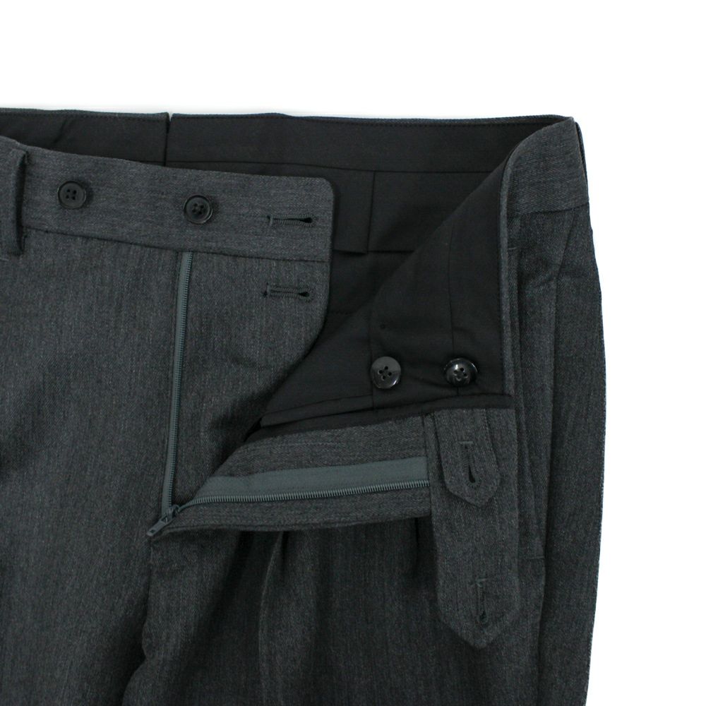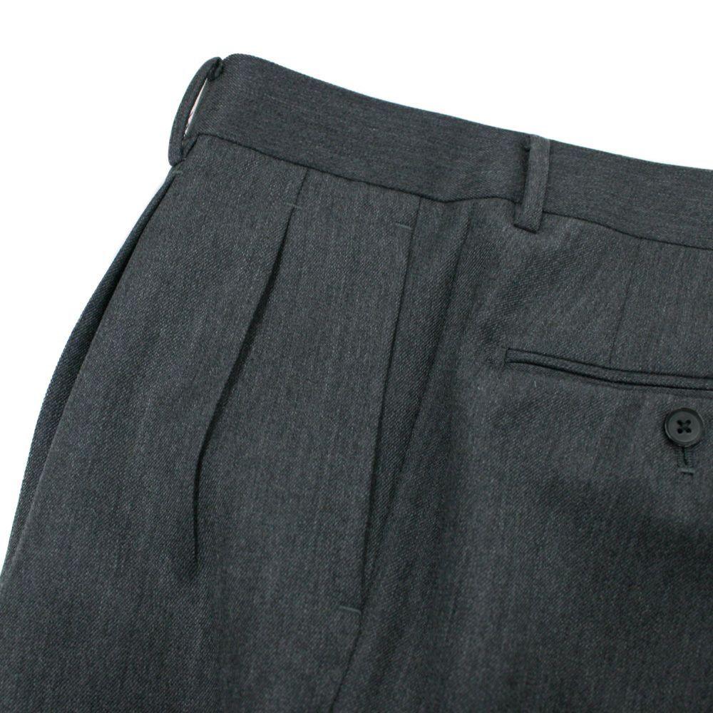クラシックな表情の2プリーツスラックス。 程よく深い股上とゆとりを持たせたワタリから裾にかけてはテーパードラインとなっており、古臭さを感じさせないシルエットです。