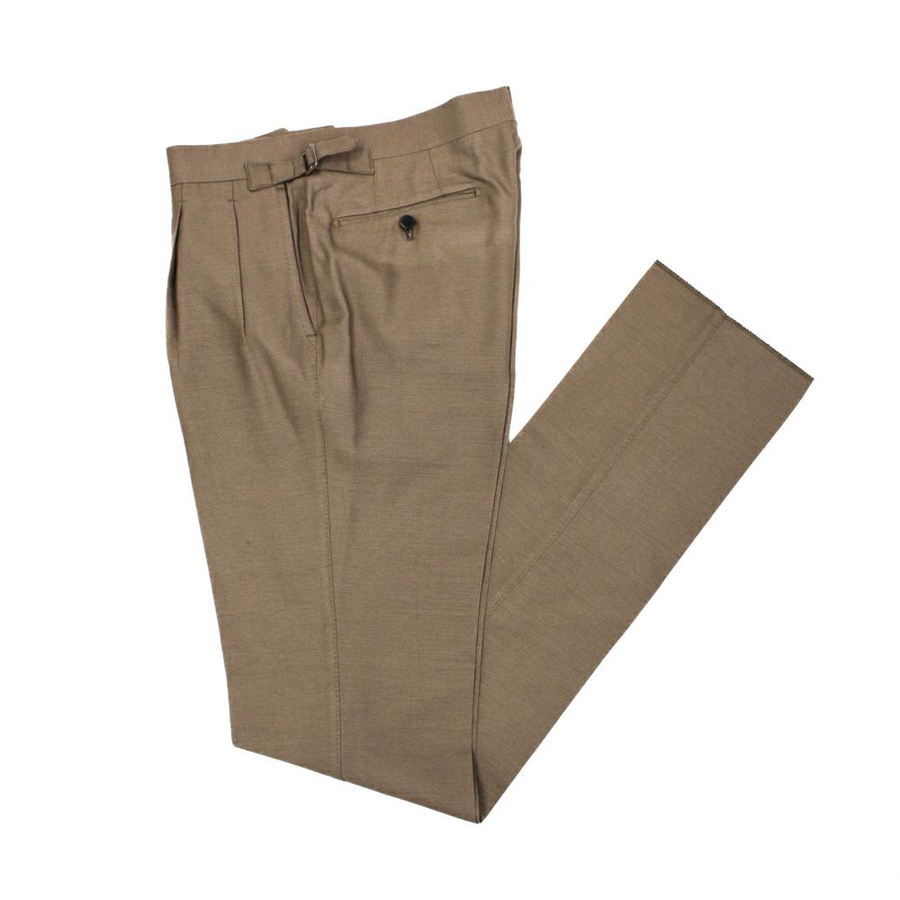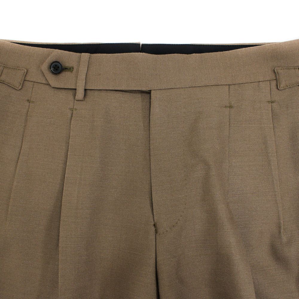 クラシックな表情の2プリーツスラックス。 程よく深い股上とゆとりを持たせたワタリから裾にかけてはテーパードラインとなっており、古臭さを感じさせないシルエットです。 ベルトをしないサイドアジャスター仕様なので腰回りがすっきりと収まるのも魅力の1つです。