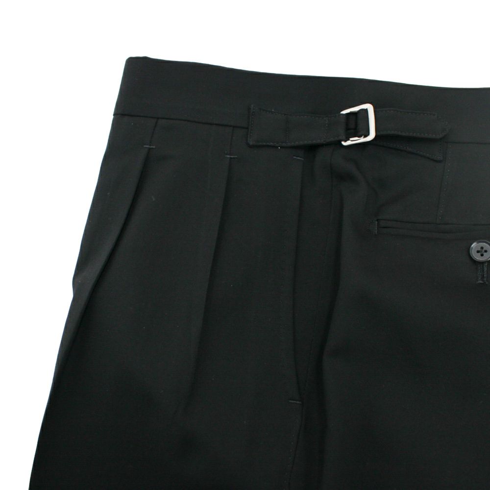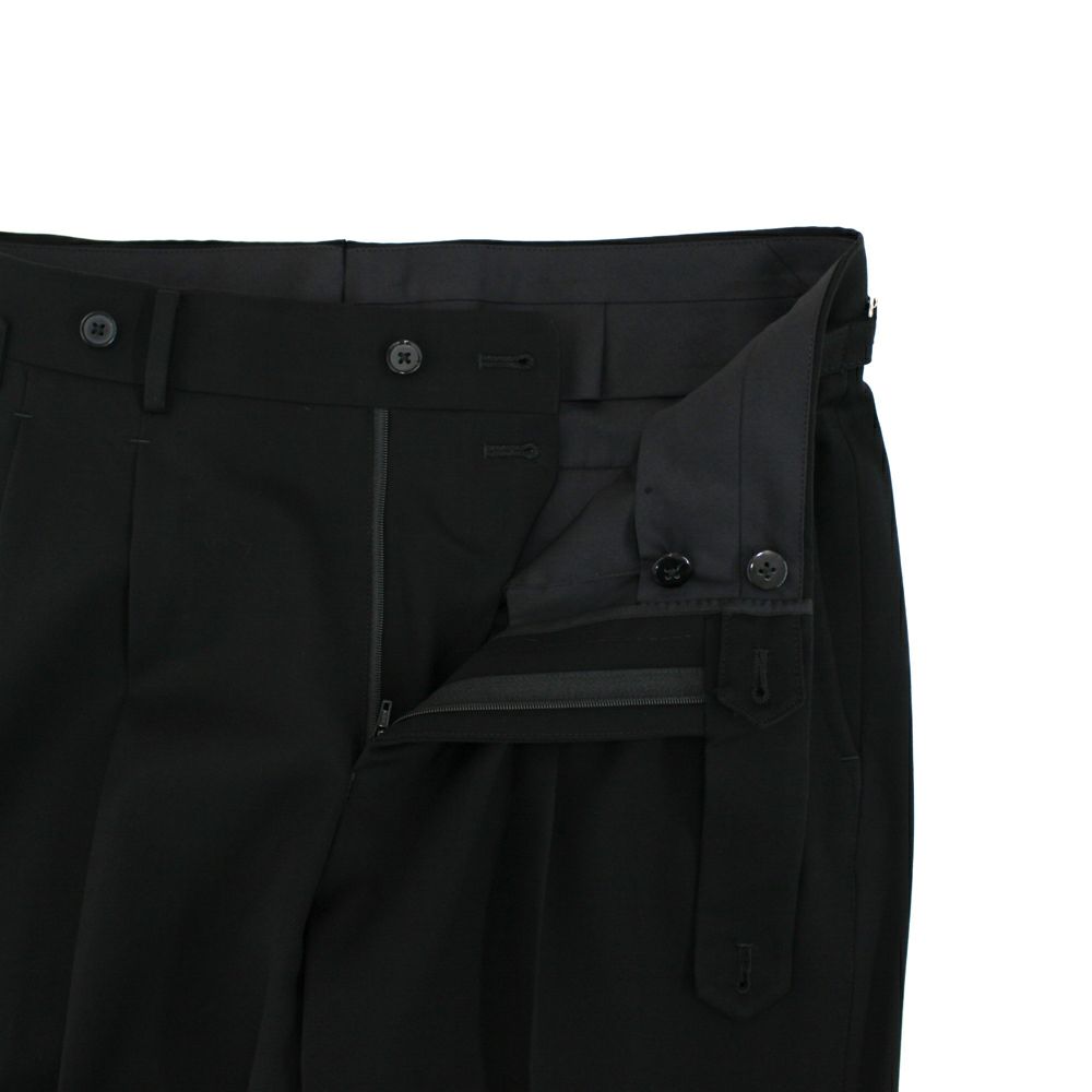 クラシックな表情の2プリーツスラックス。 程よく深い股上とゆとりを持たせたワタリから裾にかけてはテーパードラインとなっており、古臭さを感じさせないシルエットです。 ベルトをしないサイドアジャスター仕様なので腰回りがすっきりと収まるのも魅力の1つです。