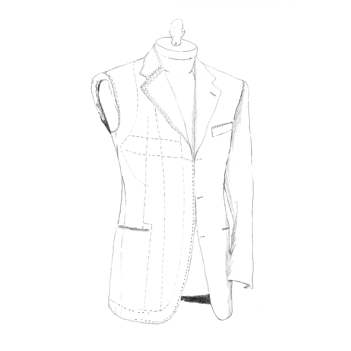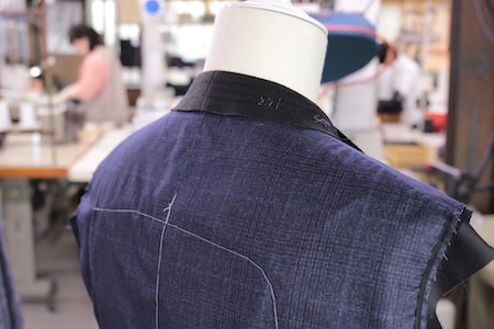 一方、毛芯縫製は、毛芯と前身頃を一枚の布のように止めていく。これを『芯すえ』といいますが、この芯すえが服の良し悪しを決める縫製上の命ともいえます。この縫製には熟練の技術が必要です。生地の厚薄、剛柔などをしっかりと見分け、その特性に合わせて芯すえをおこなう。そして出来上がっていくに従って、平らな生地に立体的な丸みが生じ、体に馴染んだ着心地をつくり出す。