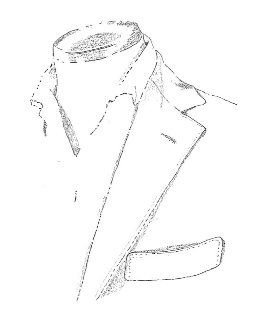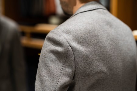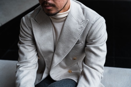 袖を通した時にはラペルが美しく返り、襟端は身頃から浮かず綺麗に沿うように作り上げています。