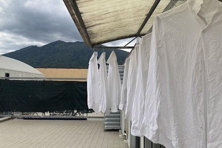 これを縮絨といいます。縮絨を施し、生地が落ちつくまで寝かし、素材が安定した時に裁断する。縮絨専門の業者に依頼するメーカーも多いですが、素材にあった温度と時間を調整するために、これを自社で行う。常に最高の状態を作りだすために。